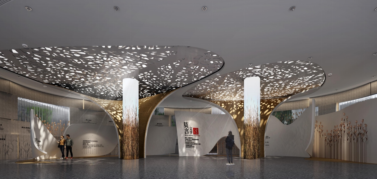 Gold Mantis 《红高粱》佳作闻名遐迩, 一本《蛙》斩获茅盾文学奖 与诺贝尔文学奖两大奖项。 书本所蕴含的智慧等待我们探寻, 作者莫言先生的故事也值得我们了解, 世界级文学殿堂—— 建成后的莫言文学馆将指引答案。 01 缘起:直通文学王国的精神堡垒 近年来,随着莫言获得了世界文学至高荣誉——诺贝尔文学奖,莫言文学超越了文化的界限,成为一张中国名片,在世界范围内产生广泛影响。山东省高密市借力“莫言”效应,着力打造红高粱文化旅游品牌。 Mo Yan 莫言 首位中国籍诺贝尔文学奖获得者 本名管谟业,1955年出生于山东省潍坊市高密市,中国作家协会副主席,著有《红高粱家族》《檀香刑》《蛙》等众多佳作。 红高粱小镇位于高密市临港经济区核心区,占地9平方公里,总投资103亿元。小镇以莫言文学和红高粱文化为核心,植根于莫言的文学故乡,以莫言旧居、莫言文学馆、红高粱影视城为核心载体,突出展示莫言的文学成就及高密的文化底蕴,促进世界文学交流,打造“一带一路”的文化交流样板区。 其中,莫言文学馆作为文旅小镇的核心,用地116亩,展馆占地10亩,建筑面积23000平方,总投资3亿元。金螳螂文化于近期中标莫言文学馆的设计施工项目,将深度解析莫言文学内涵,通过前沿设计与专业施工倾力呈现莫言文学王国的魅力。 02 文学馆空间:与时间对话的艺术 对于我们而言,任何一个展览项目都是一种独特的使命。它从全面而彻底的构思开始,以严格甚至严酷的执行结束,从而使创意能够转化为真正鼓舞人心的参观体验。 展陈设计中,金螳螂文化设计团队以“我是一个讲故事的人”为设计理念,用唤起感官联觉的创新展陈形式,将莫言的文学内涵转化为具象的艺术展示。 莫言文学馆展陈设计 初步效果图 前厅内,利用层高优势,打造明亮通透、大气磅礴的艺术化空间。正中间的艺术造型以科技手段结合纸张的艺术表现形式,红高粱艺术装置作为点缀,以一种有机的设计让空间融于自然,浑然一体。日光倾泻带来无限希望和遐想,就像莫言的文学作品,用文字突破时空形成的经纬限制。 金螳螂文化设计团队充分解读建筑设计语言,依据建筑形态合理规划展陈布局,充分利用中庭中空的建筑特点,依托莫言的文学特性,引入时间与光影的语言,为高密人民竖起新的精神地标,打造辐射全国、乃至世界文学界的人文殿堂。 03 打破常规的艺术设计:自然与本真 围绕莫言构建的“高密东北乡”的文学地理概念,用“出走、找寻、回归、超越”四个阶段递进式构筑“莫言的文学王国”,让观众得以从一个全新的视角和维度认识到莫言文学的价值,沉醉于莫言文学的艺术魅力。 除展览空间之外,莫言文学馆还配备有阅览室、报告厅、文学研究室、文创空间与办公室,兼具展示性与功能性。 希望构建人与自然、空间与自然的相互联系,唤醒心灵最深处的记忆,体验其背后的精神实质,将设计原则中所体现的自然、和谐、秩序,统一在物理空间内,力求寻找人体尺度与心灵广度的回归。